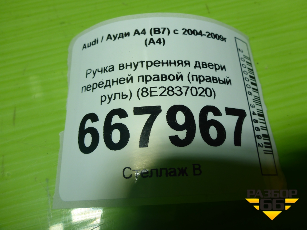 Ручка внутренняя двери передней правой (правый руль) (8E2837020) для Audi A4 (В7) с 2004-2009г (А4) в Москве