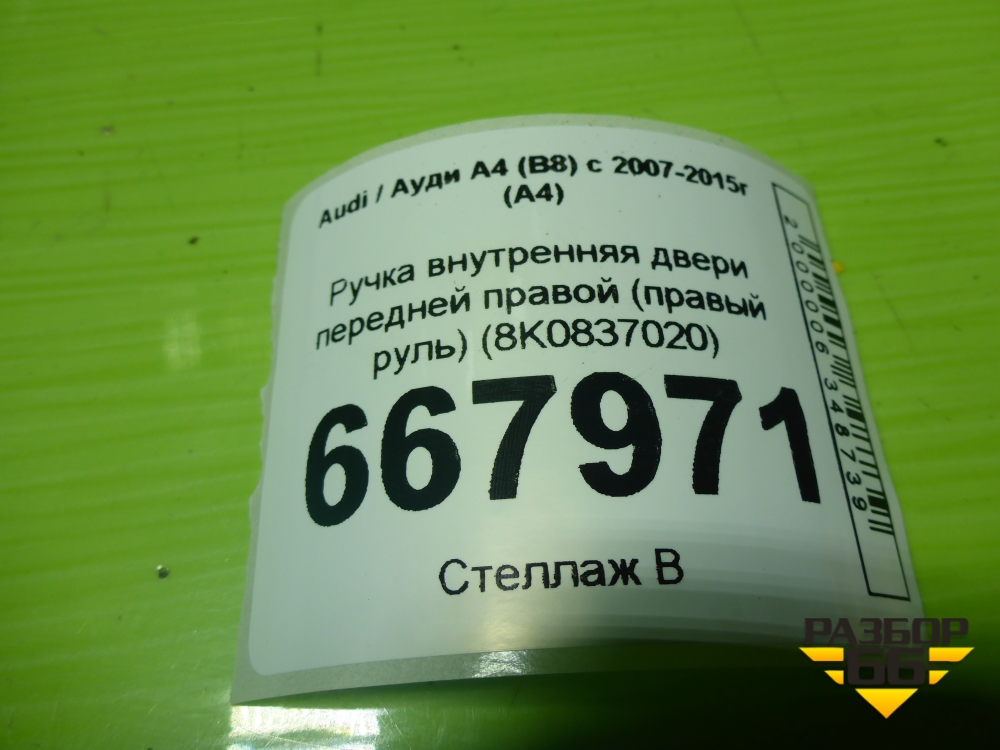 Ручка внутренняя двери передней правой (правый руль) (8K0837020) для Audi A4 (В8) с 2007-2015г (А4) в Москве