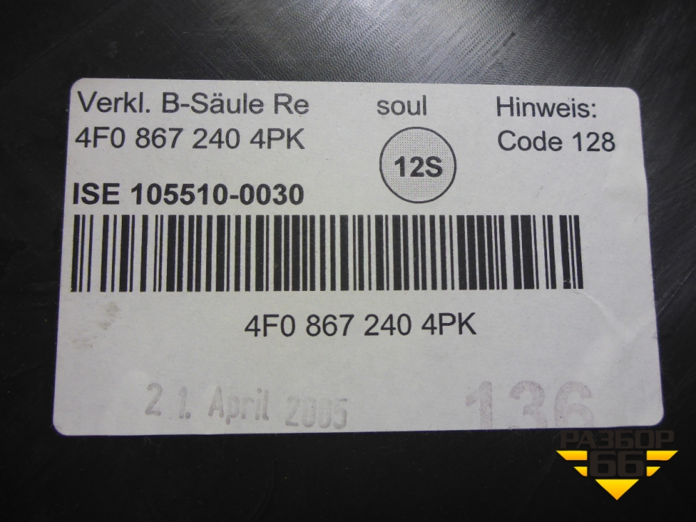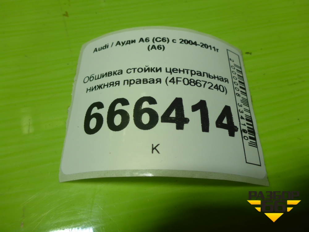 Обшивка стойки центральная нижняя правая (4F0867240) для Audi A6 (C6) с 2004-2011г (А6) в Москве