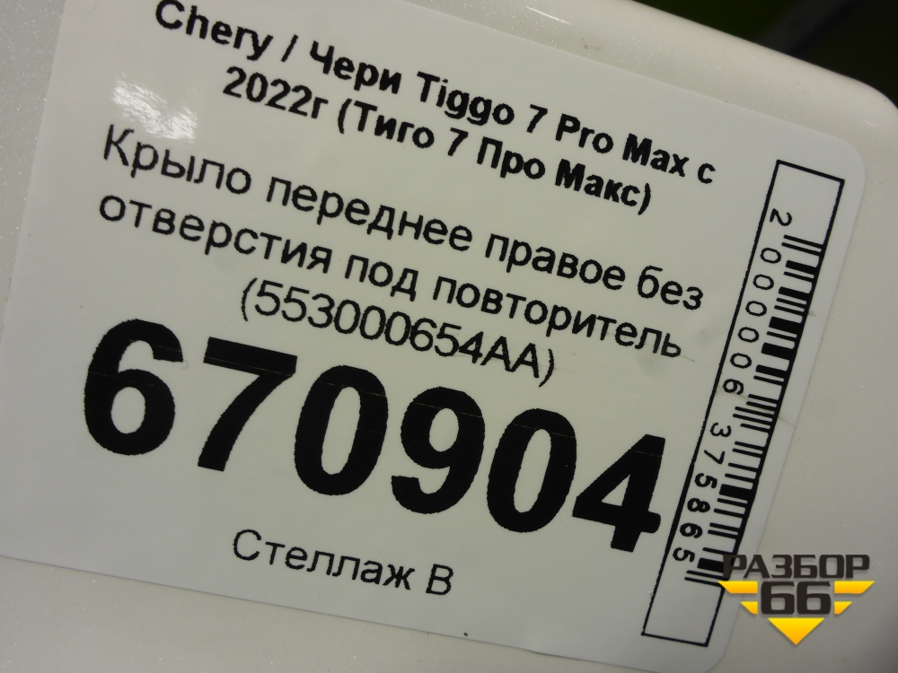 Крыло переднее правое без отверстия под повторитель (553000654AA) для Chery Tiggo 7 Pro Max с 2022г (Тиго 7 Про Макс) в Москве