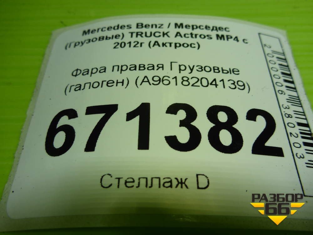 Фара правая (галоген) (A9618204139) для Mercedes Benz TRUCK Actros MP4 с 2012г (Актрос) в Москве