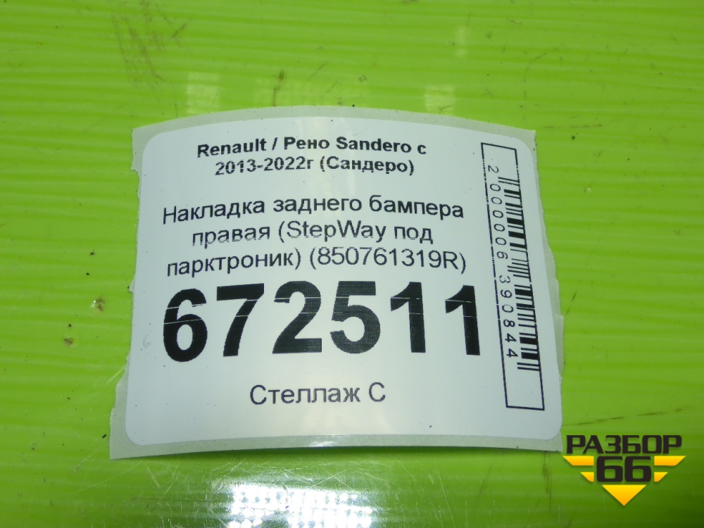 Накладка заднего бампера правая (StepWay под парктроник) (850761319R) для Renault Sandero с 2013-2022г (Сандеро) в Москве
