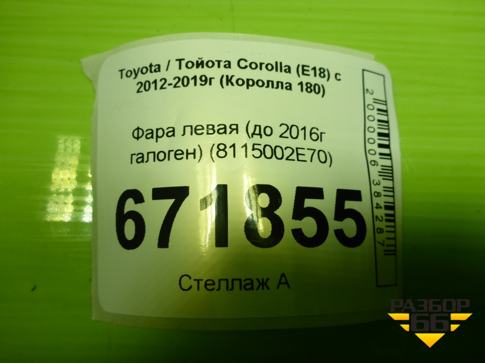 Фара левая (до 2016г галоген) (8115002E70) для Toyota Corolla (E18) с 2012-2019г (Королла 180) в Москве