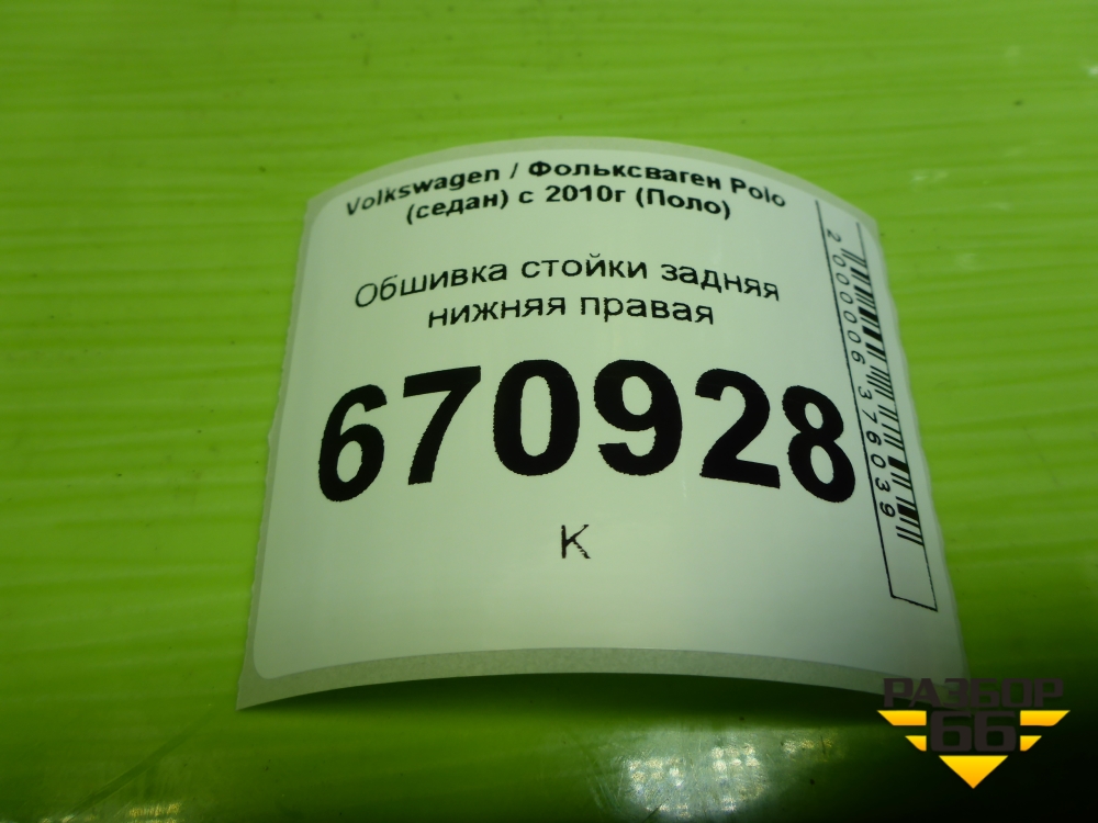 Обшивка стойки задняя нижняя правая (6RU867766) для Volkswagen Polo (седан) с 2010г (Поло) в Москве